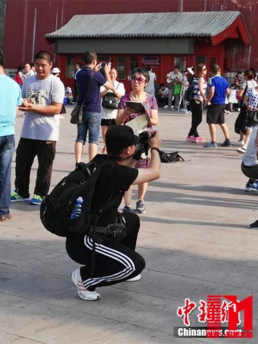游客在故宫北门外拍照。中新网记者 宋宇晟 摄