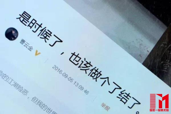 其暗指的“曾用云字名者二人”之一曹云金,9月5日在微博公开发表文章《是时候了,该做个了结了》,将师徒二人多年纠葛,一一陈列曝光在众人面前,把这场风波推向高潮。文中提到:“你可真有意思,从来不敢指名道姓,一贯含沙射影,就因为不再给你赚钱了,你逼走了我们,现在你栽赃陷害,强加一些莫须有的罪名在我们身上,对我们赶尽杀绝,置我们于死地!” 截至9月11日此文阅读量已超5700万。