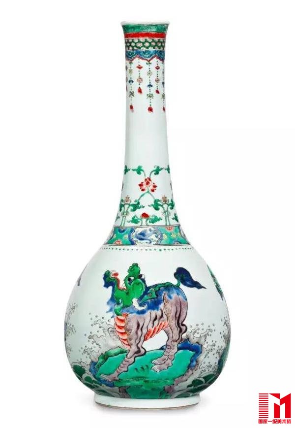 清康熙 五彩瑞兽纹大长颈瓶,估价美元30,000-50,000,34.1万美元成交