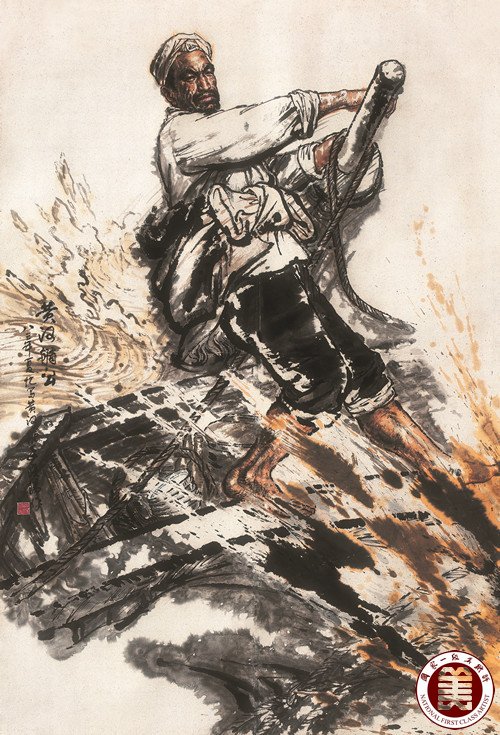 杨晓阳少年时代私淑于著名画家刘文西,未及弱冠即考入西安美术学院国画系,因获刘文西先生之亲炙,深得写实主义精髓,遂成一代翘楚。观其早年之作,当知其法脉传承之正统。如《黄河之歌》(1983)、《黄河艄公》(1983)、《大河之源》(1986)、《黄巢进长安》(1987)等作品,其造型之形神兼备,笔墨之沉雄厚重,无不罄写实之矩镬,集中体现了晓阳在写实主义中国画方面所取得的成就。依我看,这一成就不仅纤毫毕现地显示出晓阳对写实主义语言及相关学科如透视学、解剖学、光影学的理解,也完整地呈现了他对现实主义叙事逻辑的准确把握。如果有足够的敏感,还可以看出,即便在严谨的写实主义规矩与法度面前,晓阳还是试图表现出笔墨的写意性和抒情性,尽管这种表现是如此的隐晦,如此的若不经意。比如《黄河艄公》一作,以清刚雄肆之笔写黄河艄公振臂挥桨搏击于惊涛骇浪之间的情景。于写实而言,此画可谓无法不备。画面以形象与空间塑造为核心,浓墨层层积染至碑椎般黝黑,浑然几近雕塑之体量,然笔墨又不完全为物所累,其点画波磔之变皆奔赴腕底,涨墨渴笔,翻扰作势,时带飞白之意,尽显纵横争折之美,更以金刚怒目,声如裂帛之势,与天水云气共吞吐。观其精神气象,浩浩乎一如乃师,而又益肆其风,不为町畦之所拘。